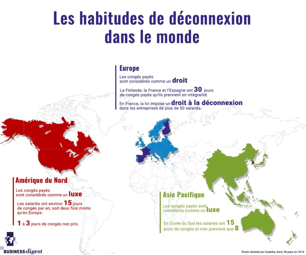 D’après un entretien avec Gil Gordon, auteur de Turn It Off : How to Unplug From the Anytime-Anywhere Office Without Disconnecting Your Career (juin 2017), « The Professional’s Guide toa Stress- Free Vacation » de Carolyn O’Hara (Harvard Business Review, 14 août 2014), « 3 Negative Messages You Send Your Boss When You Don’t Disconnect While on Vacation » de Michel Theriault (Forbes, 4 mai 2017) et « The Right Way to Unplug When You’re on Vacation » signé Alexandra Samuel (Harvard Business Review, 15 juillet 2014).