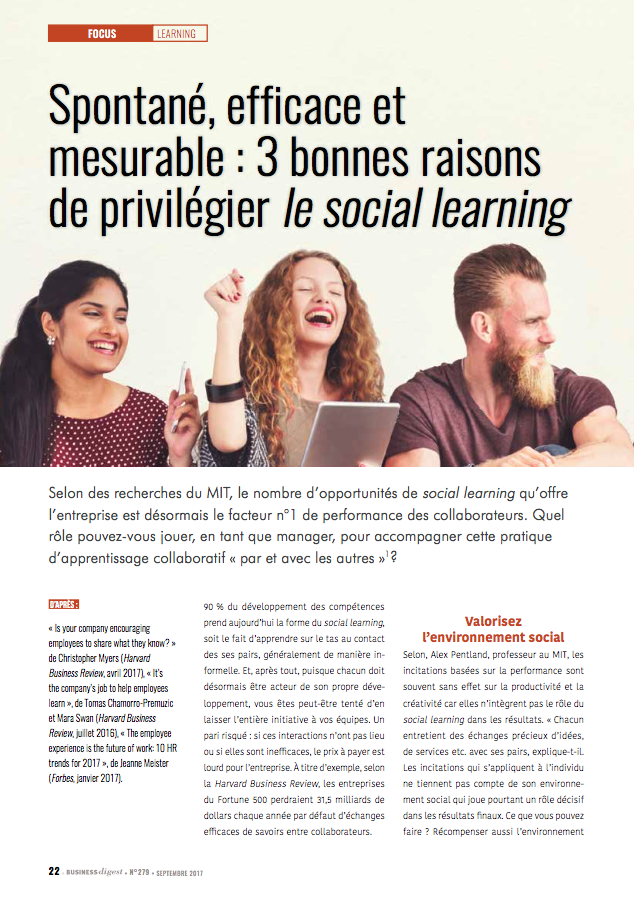 Selon des recherches du MIT, le nombre d’opportunités de social learning qu’offre l’entreprise est désormais le facteur n°1 de performance des collaborateurs. Quel rôle pouvez-vous jouer, en tant que manager, pour accompagner cette pratique d’apprentissage collaboratif « par et avec les autres » 1 ?